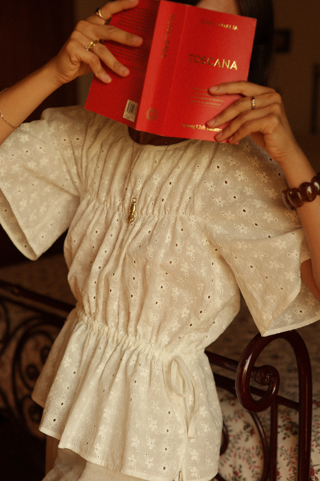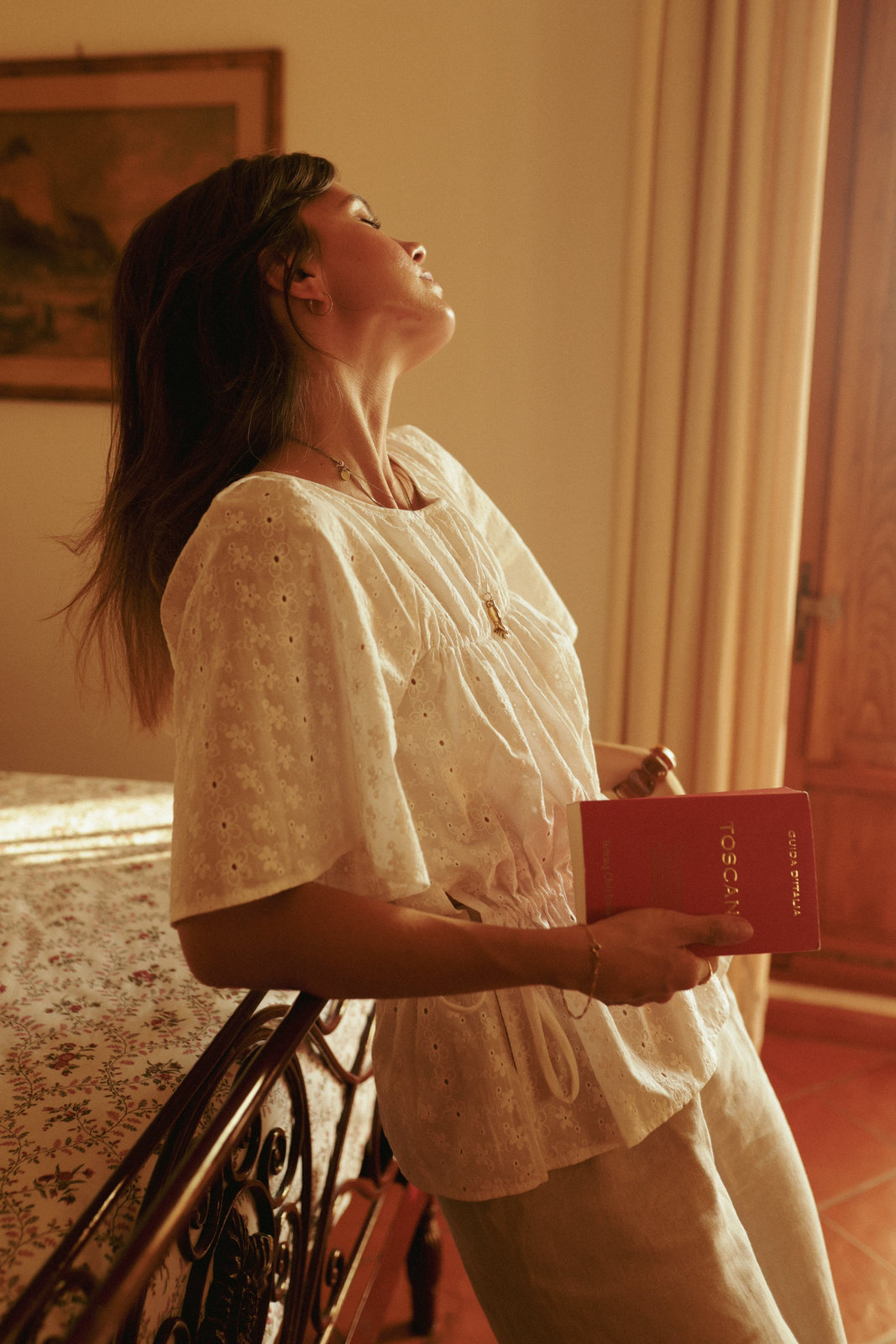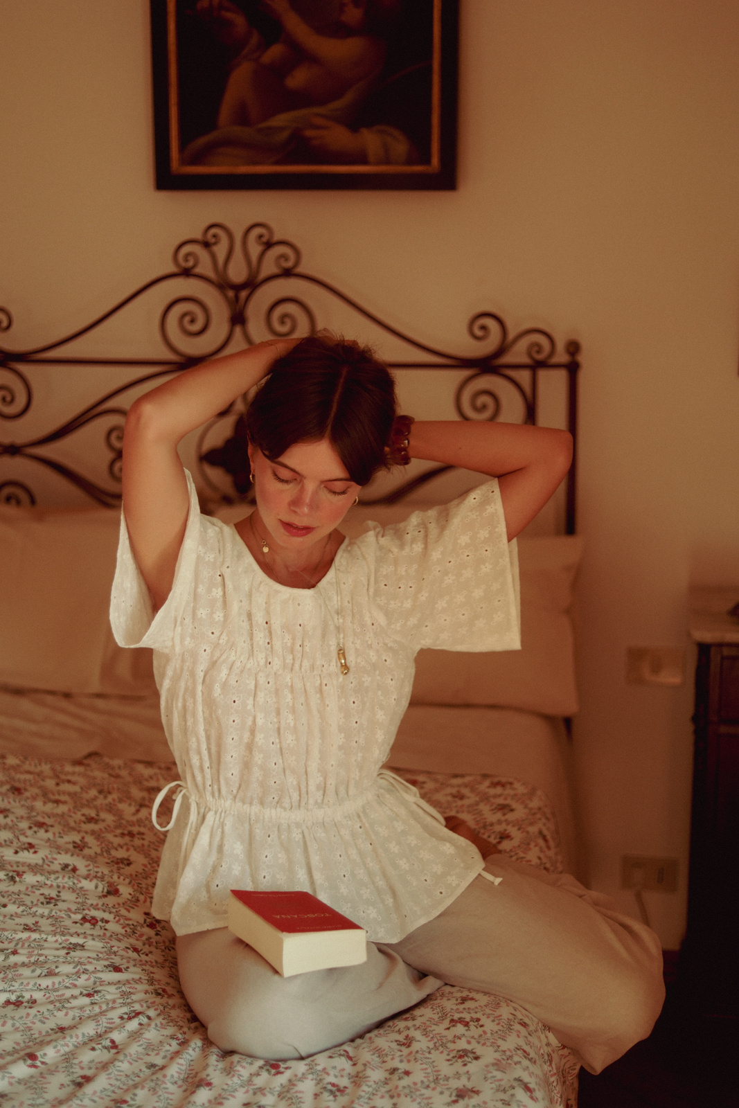 Powolny poranek w Toskanii. Złote światło wpada przez lekkie zasłony, a w powietrzu unosi się zapach świeżo parzonej kawy. Na łóżku leży przewodnik, między jego stronami ukryte marzenia o brukowanych uliczkach i winnicach po horyzont. Masz na sobie Biancę – i wszystko staje się lekkie, miękkie, proste.