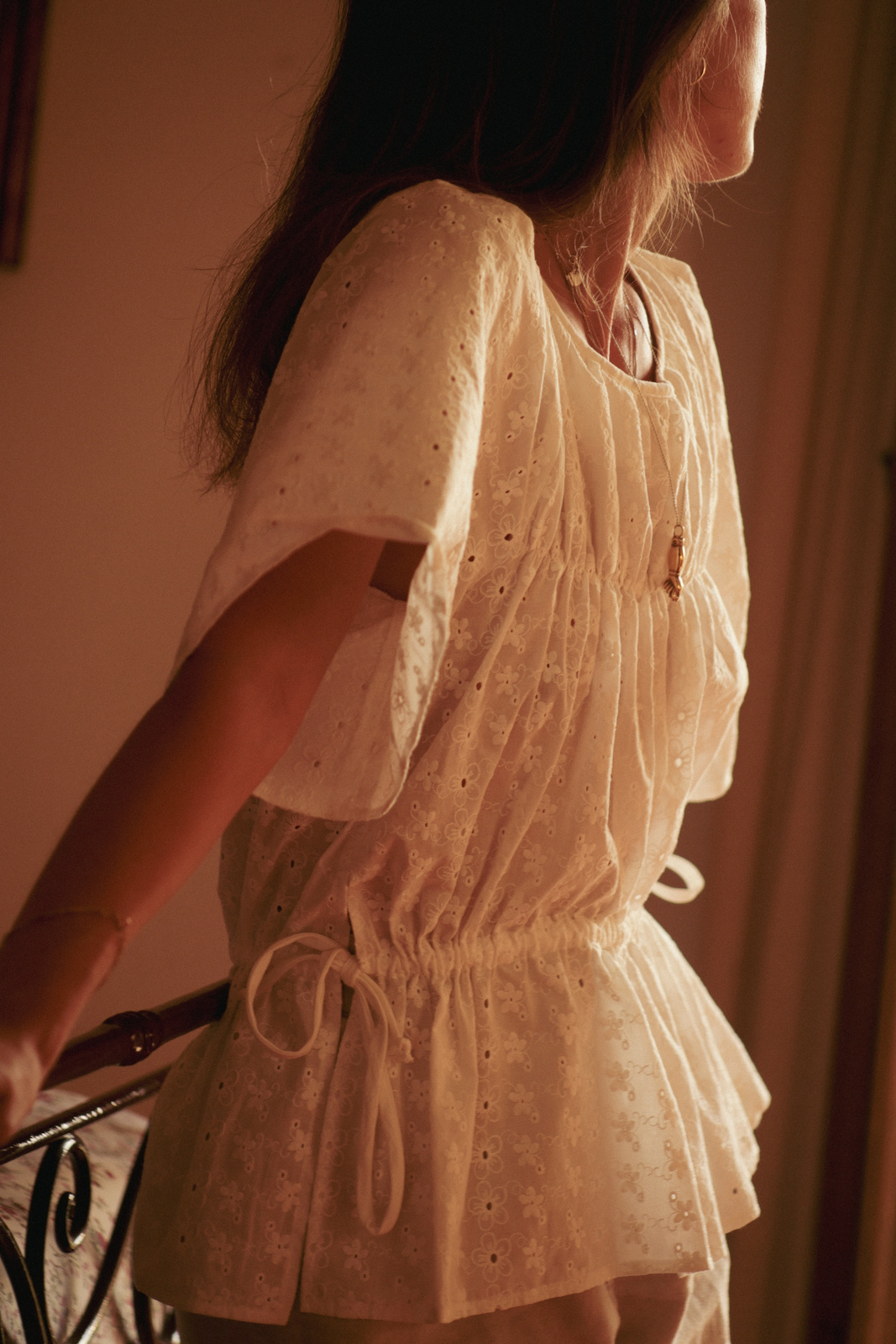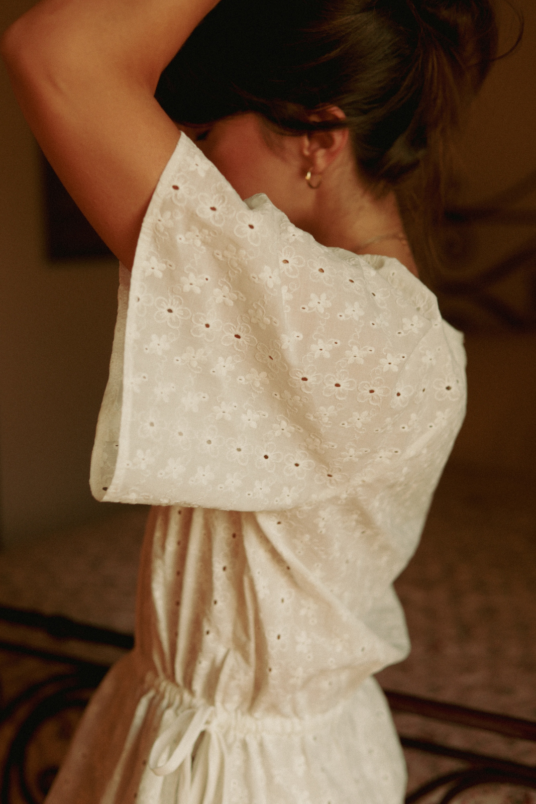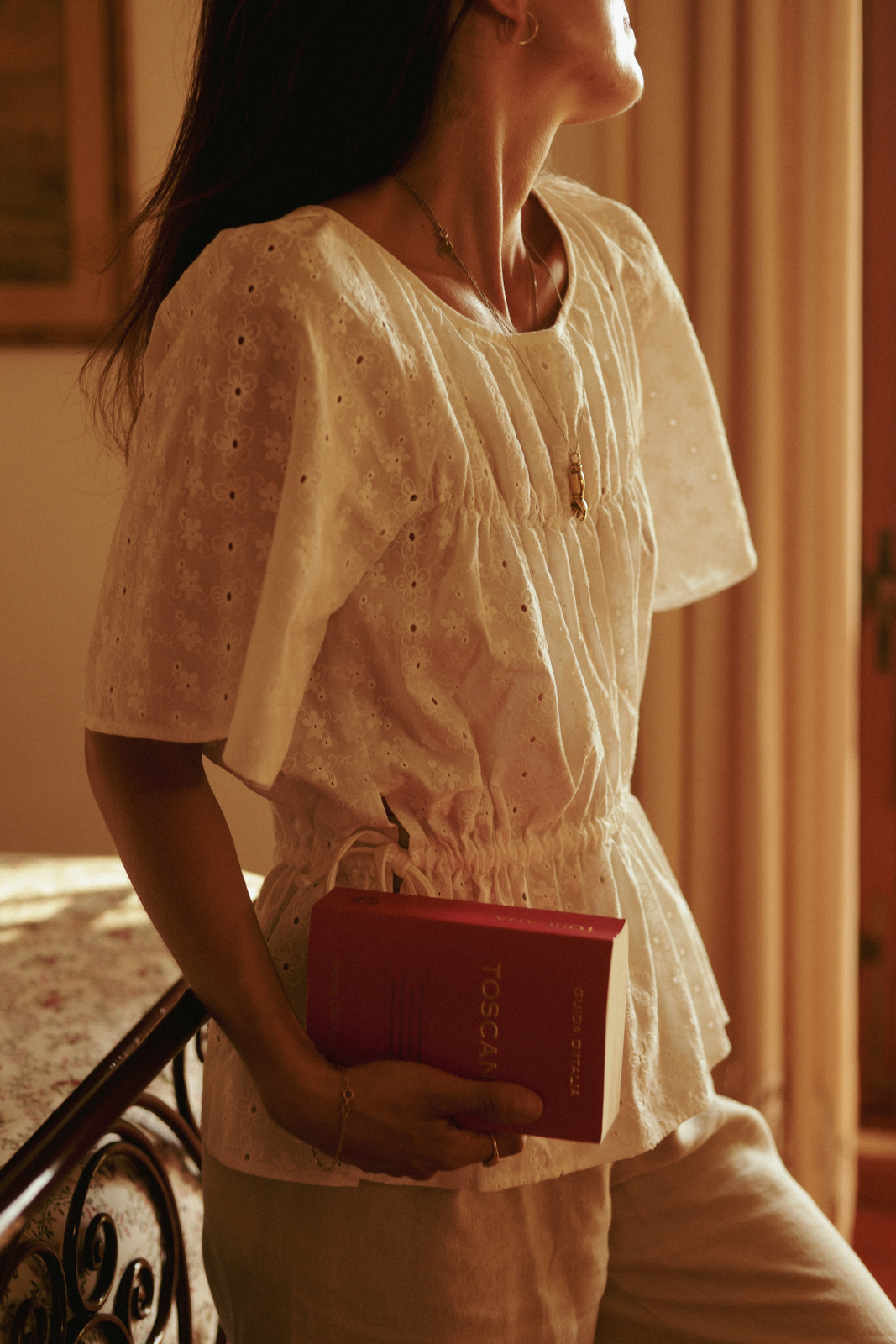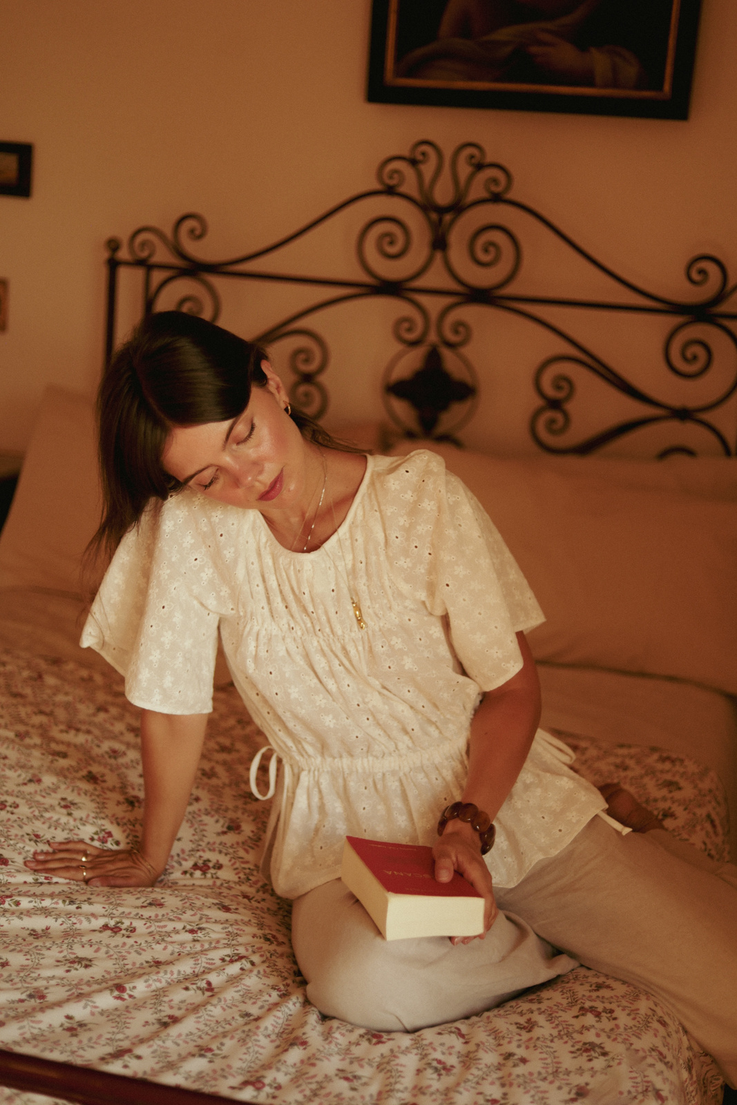 Bluzka Bianca to kwintesencja letniego uroku i delikatności. Wykonana z przewiewnej, haftowanej bawełny, zachwyca subtelnym, ażurowym wzorem i romantycznym krojem. Bufiaste rękawy, marszczenie na linii biustu oraz wiązanie w talii nadają jej dziewczęcego wdzięku, jednocześnie podkreślając sylwetkę w naturalny sposób. Idealna na słoneczne poranki z książką w ręku i leniwe popołudnia w promieniach zachodzącego słońca. Bianca to bluzka, którą po prostu się czuje – lekka jak oddech, miękka jak letni dzień.