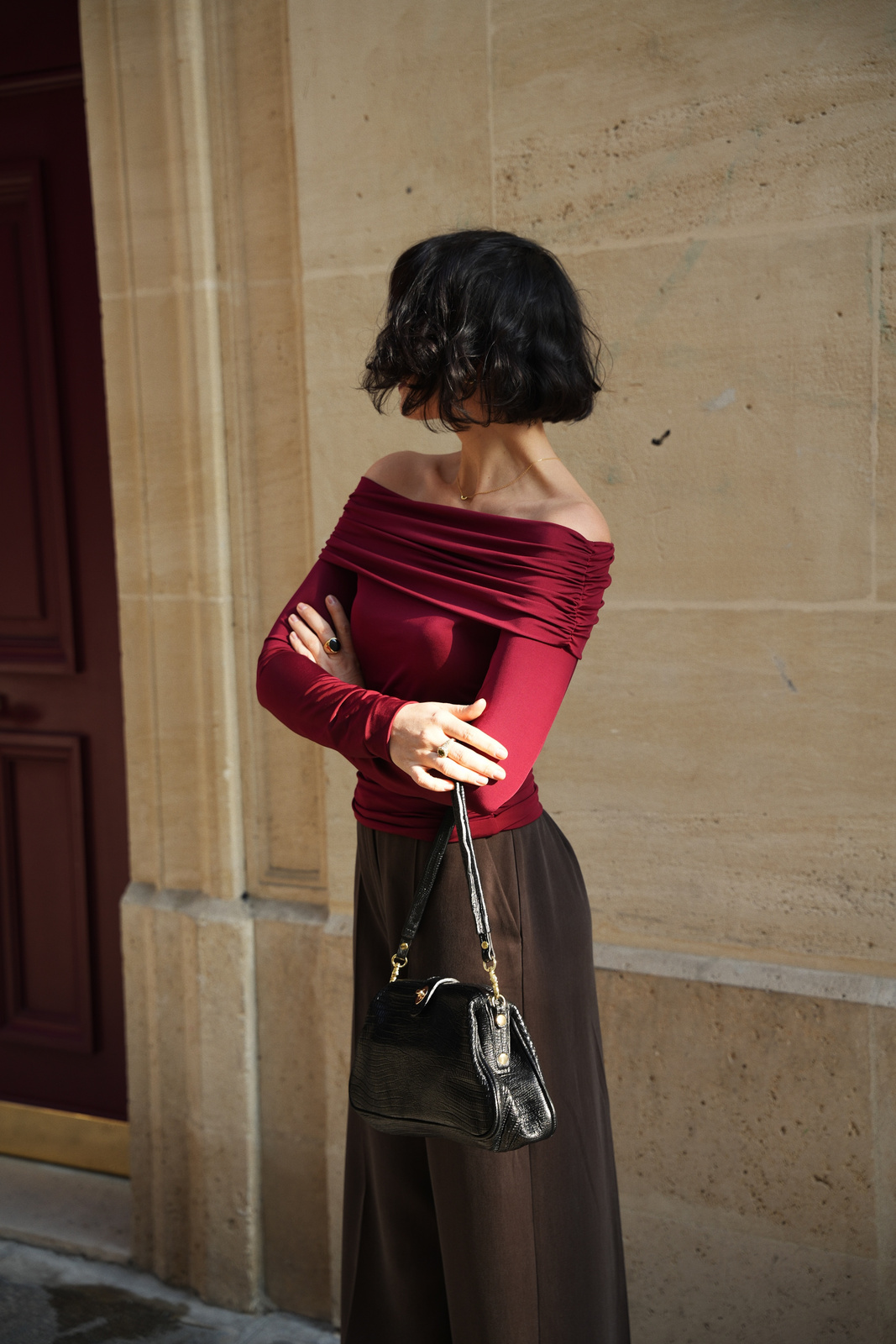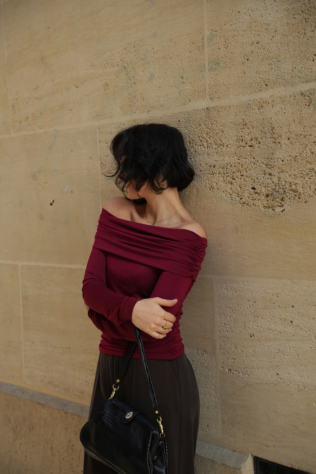 Urzekająca wyrazistym kolorem i zjawiskowym dekoltem bluzka Zoé powstała z miłości do klasyki z nutką romantyzmu. Uszyta z podwójnej warstwy dzianiny, aby zapewnić maksymalny komfort noszenia. Dekolt możesz opuścić na ramiona lub pobawić się formą i dopasować tak, jak lubisz. Marszczenia po bokach modelują sylwetkę. Dostępna w kolorze czekoladowym, bordowym i couleur champagne ♡