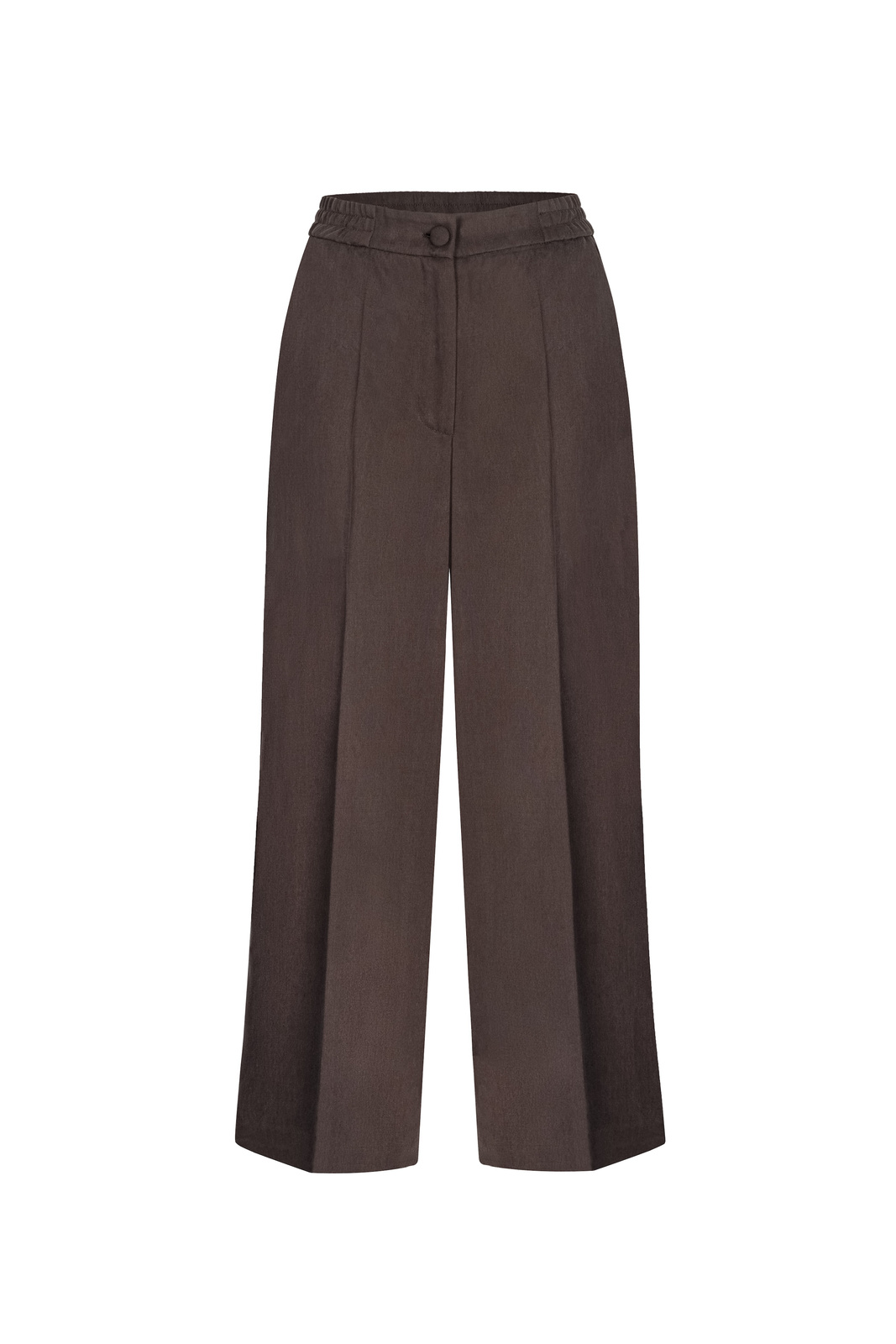 - Brązowe spodnie w kant z wysokim stanem. Zapinane na zamek i oblekany guzik.