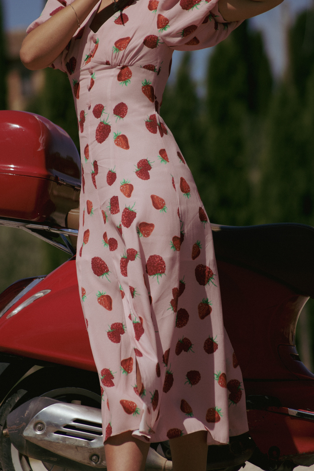 - Lekka sukienka z wiskozy z owocowym printem. Posiada wiązanie w talii oraz ozdobne guziczki. Sukienka z podszewką.