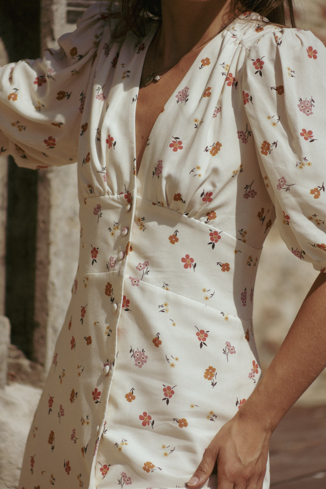Rozpinana na drobne guziczki biegnące przez całą długość, pozwala na subtelną grę z formą – możesz nosić ją tak, jak chcesz: bardziej zachowawczo lub z lekkim pazurem. Bufiaste rękawy przywołują ducha dawnych lat i dodają całości romantycznego wdzięku. Idealna na długie spacery wśród natury, ale też na filiżankę espresso w mieście.