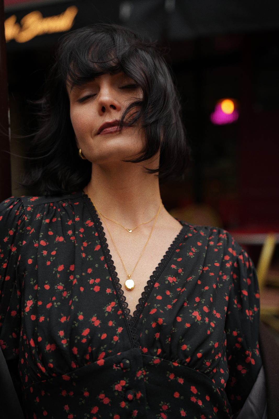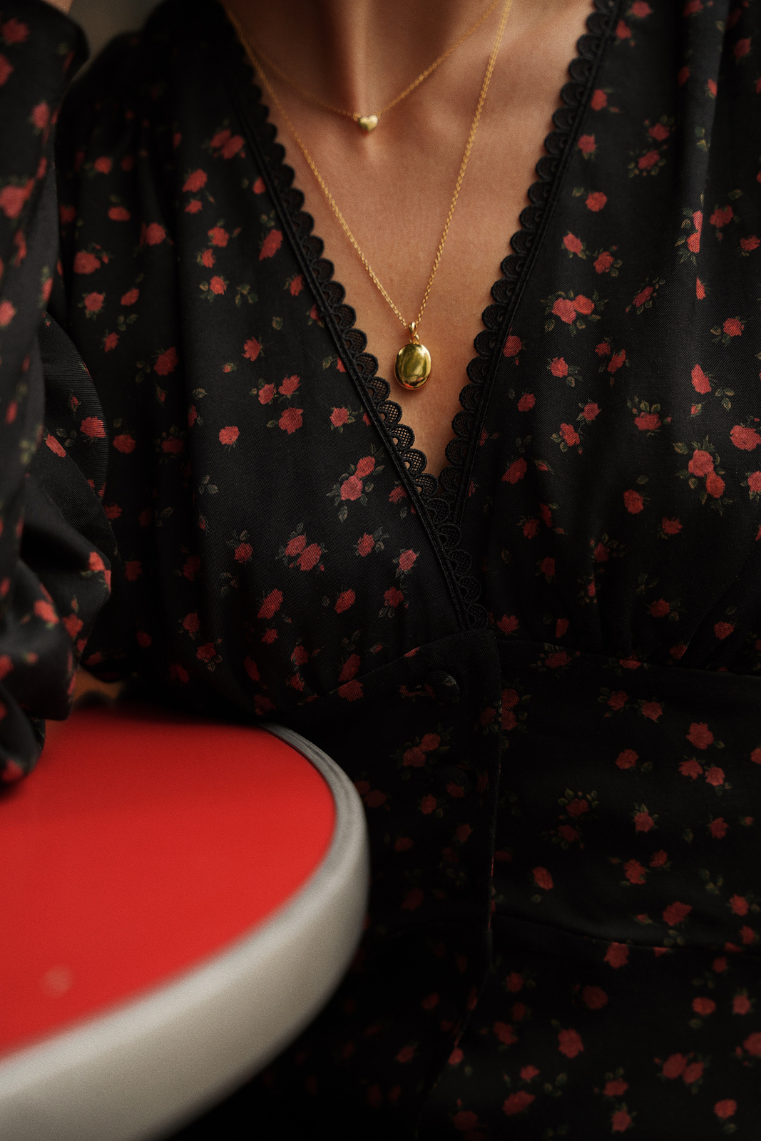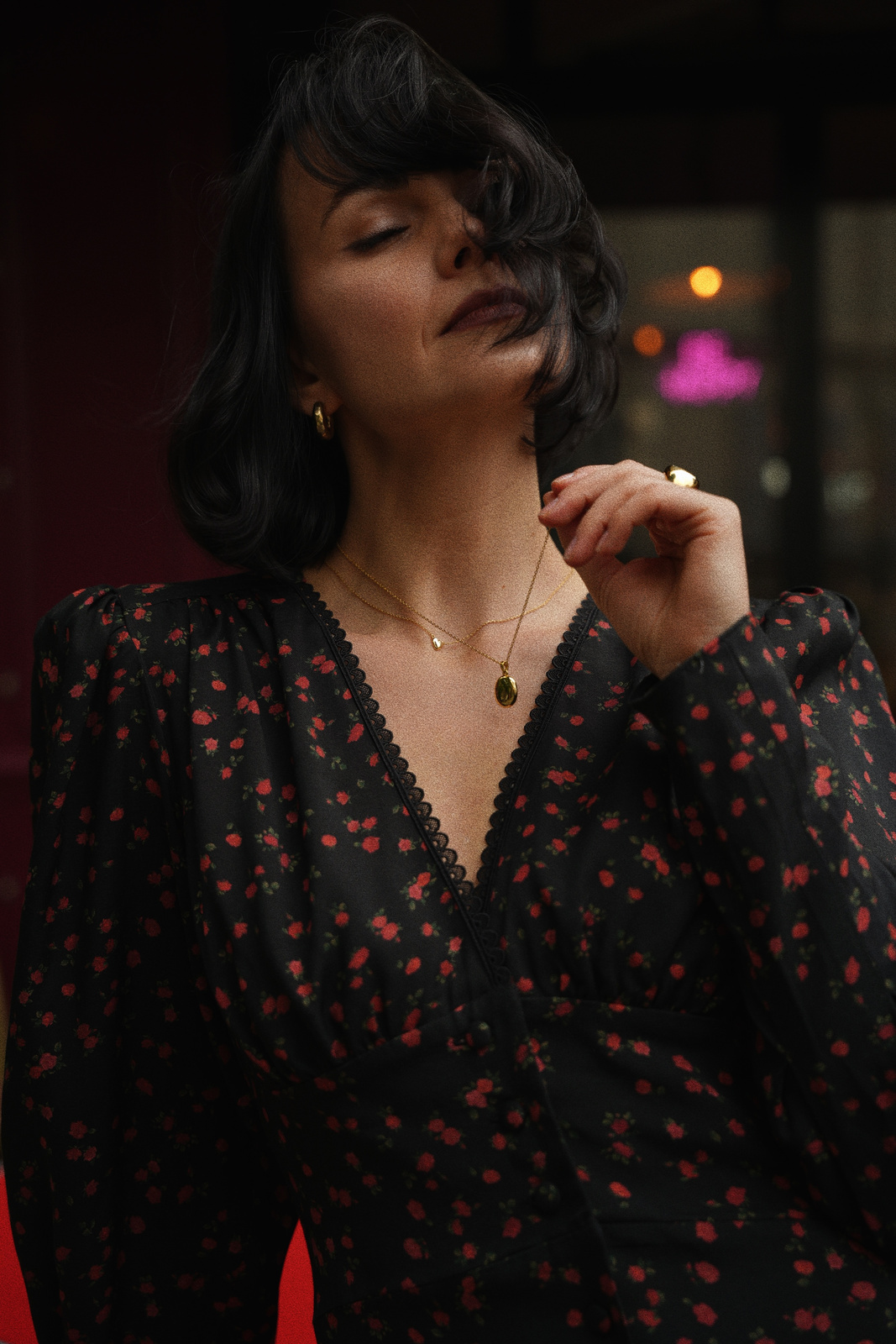 Sukienka z wiskozy Rouge to retro perełka tej kolekcji. Jej krój, dopasowanie w talii, oblekane guziczki, koronka przy dekolcie - wszystko brzmi jak powrót… do siebie. Autorski wzór w delikatne różyczki skrywa w sobie miłość, czułość i piękno oraz zdobi niczym najpiękniejsza biżuteria. Rouge jest „tą” sukienką, którą wybierzesz zarówno na najważniejsze wydarzenia w swoim życiu jak i na pyszną kolację z codziennością. Krocz w niej dumnie przed siebie. I rozkwitaj
