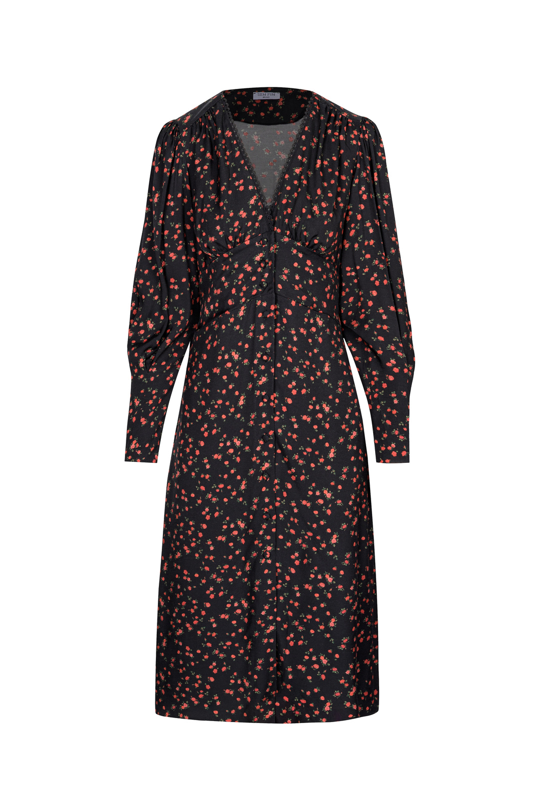 • Czarna sukienka w drobne czerwone róże. Posiada podszewkę. Zapinana na guziki.