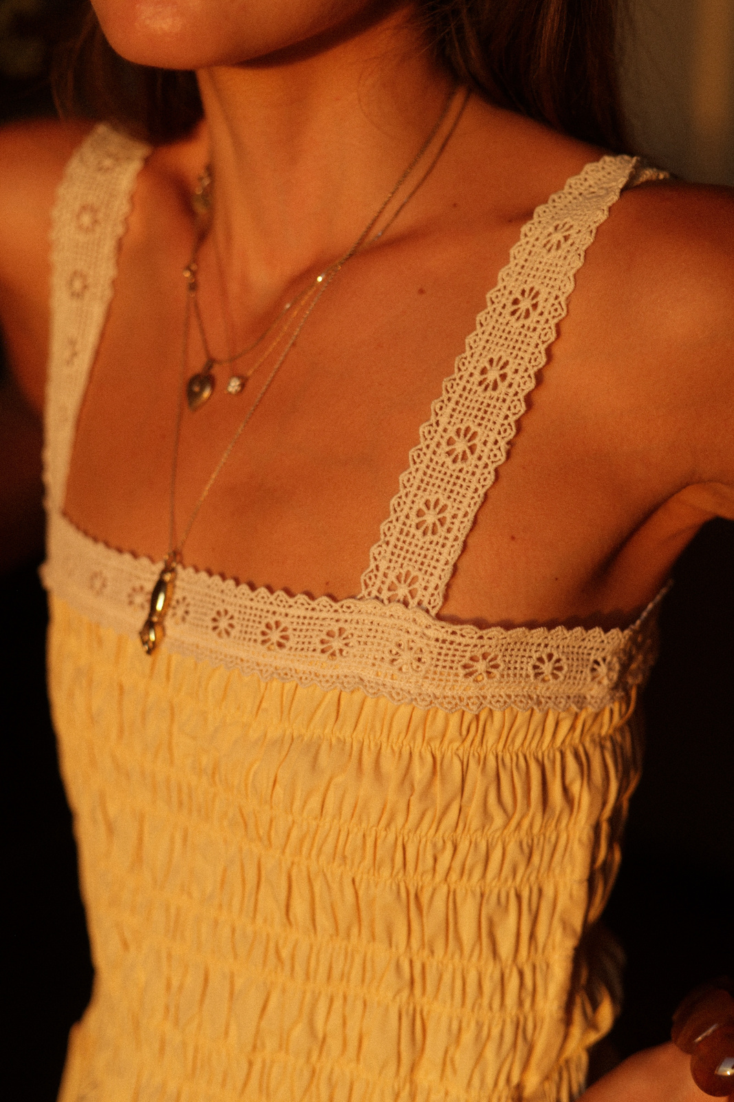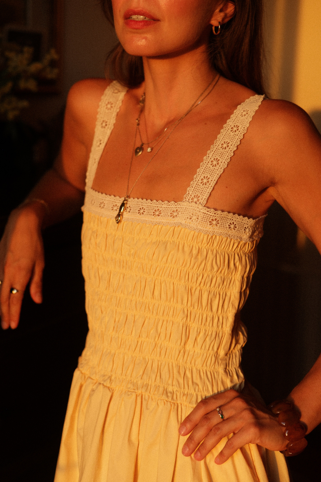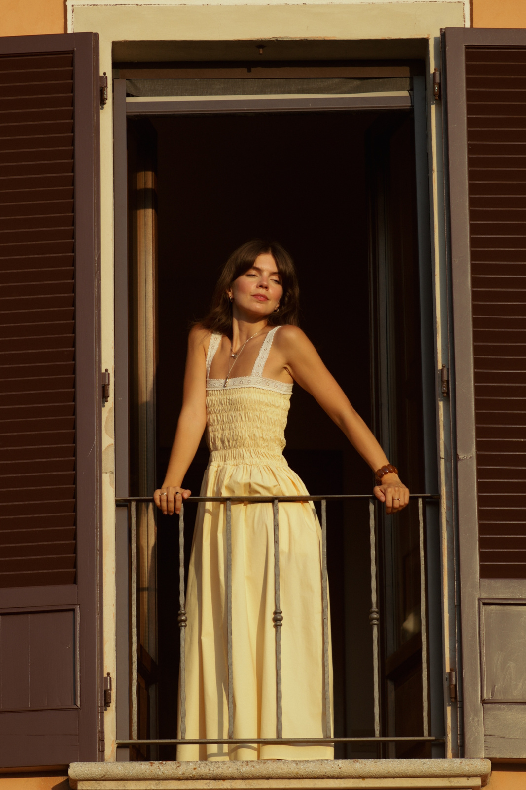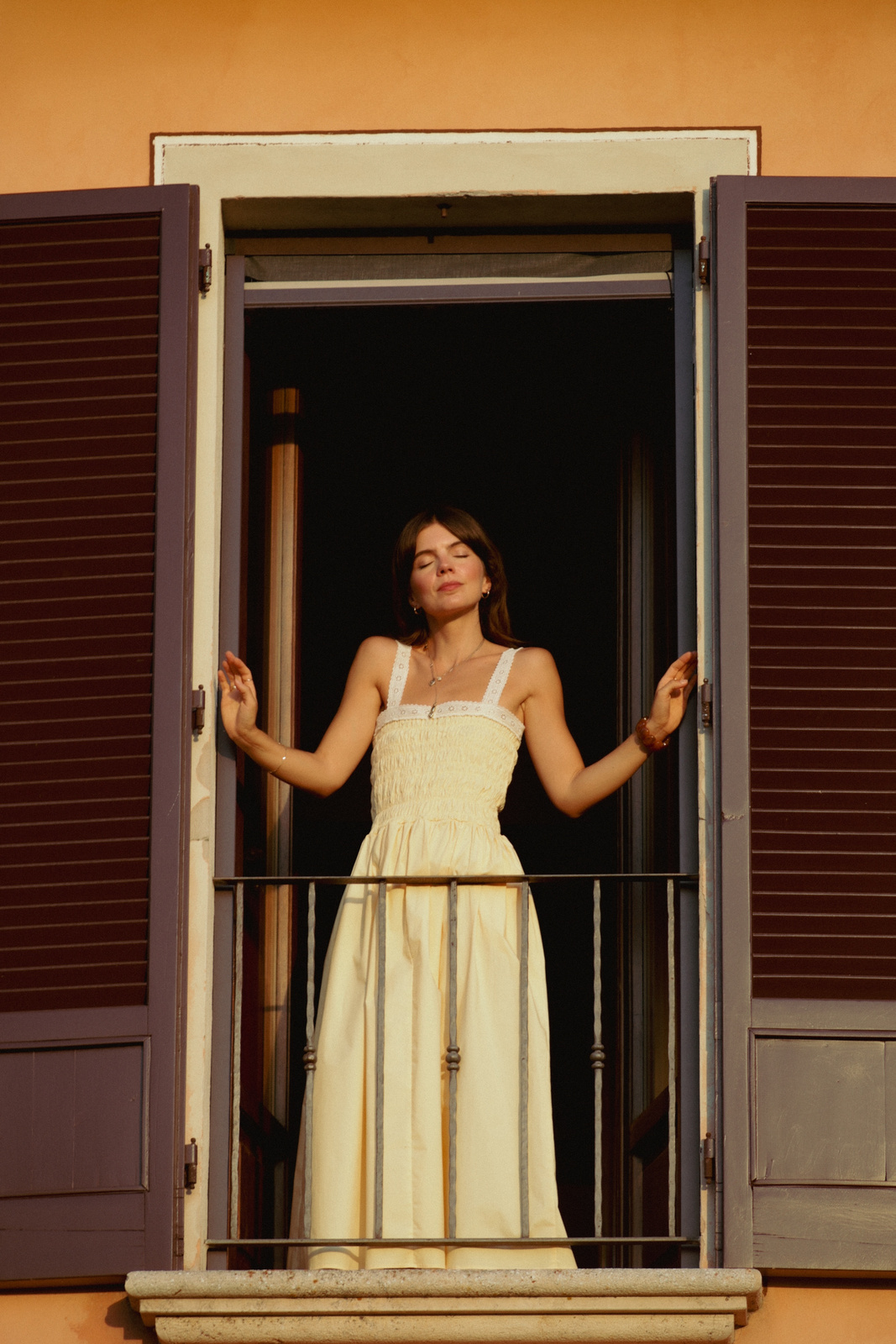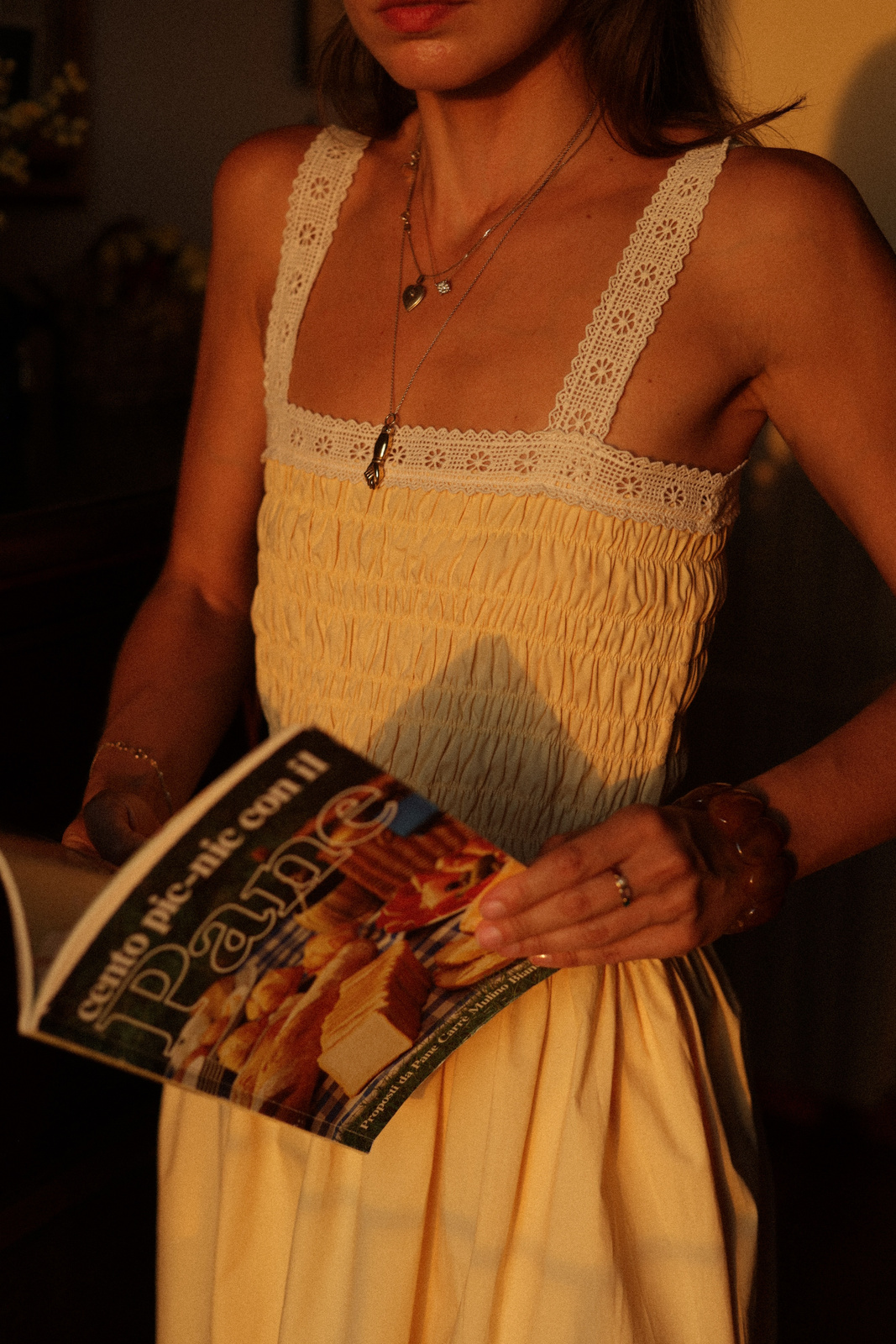 Sukienka Sole di Toscana to esencja włoskiego lata zamknięta w miękkiej, oddychającej bawełnie. Jej słoneczny, pastelowy odcień przywołuje ciepło promieni opadających na toskańskie wzgórza, a każdy detal opowiada historię beztroskich dni spędzonych w cieniu cyprysów.