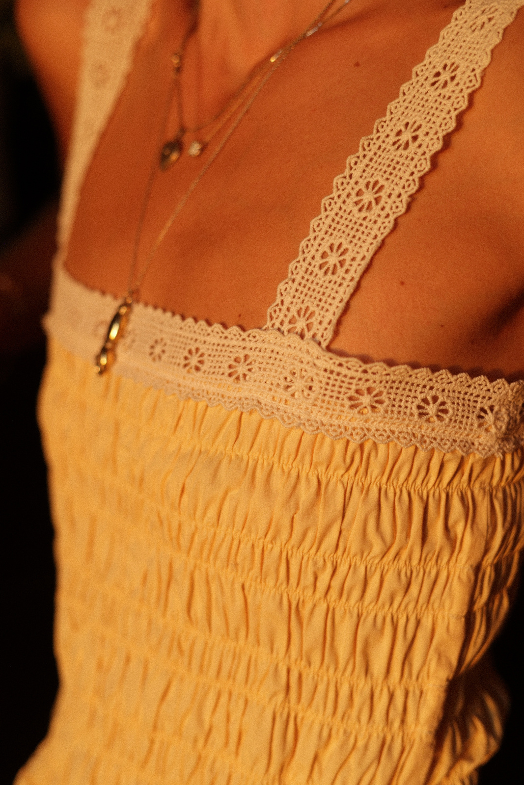 • Bawełniana sukienka z marszczonym gorsetem. Wykończona koronkową taśmą.